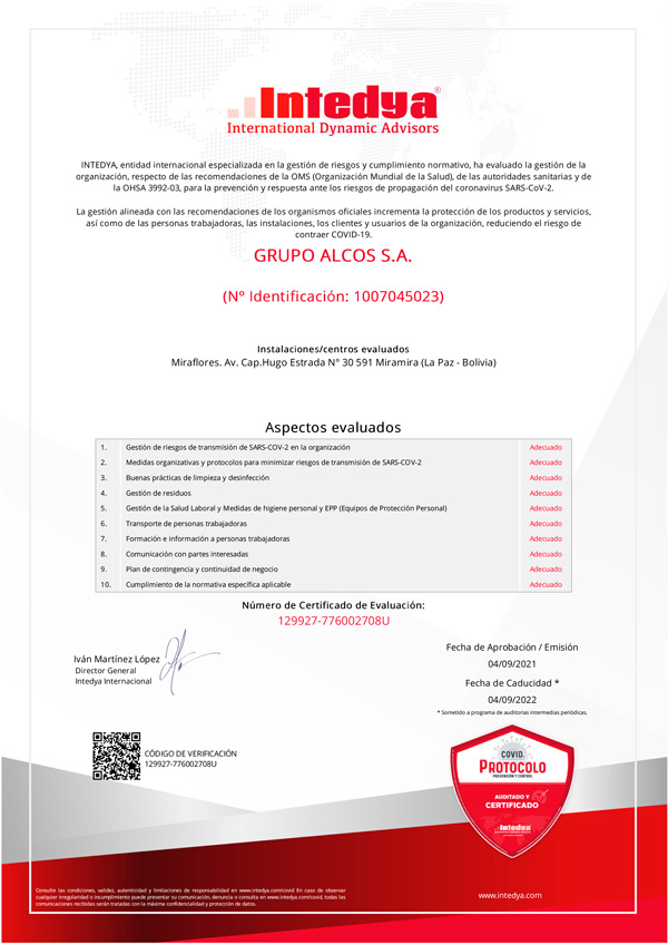 Grupo Alcos S.A., una empresa destacada en el mercado farmacéutico boliviano, líder en la fabricación y comercialización de medicamentos. Como empresa certificada en la Norma ISO 9001:2015, brindamos productos de alta calidad; día a día nos basamos en la mejora continua y estamos trabajamos para certificar las Buenas Prácticas de Fabricación, con el fin de exportar sus productos al resto de Sud América.